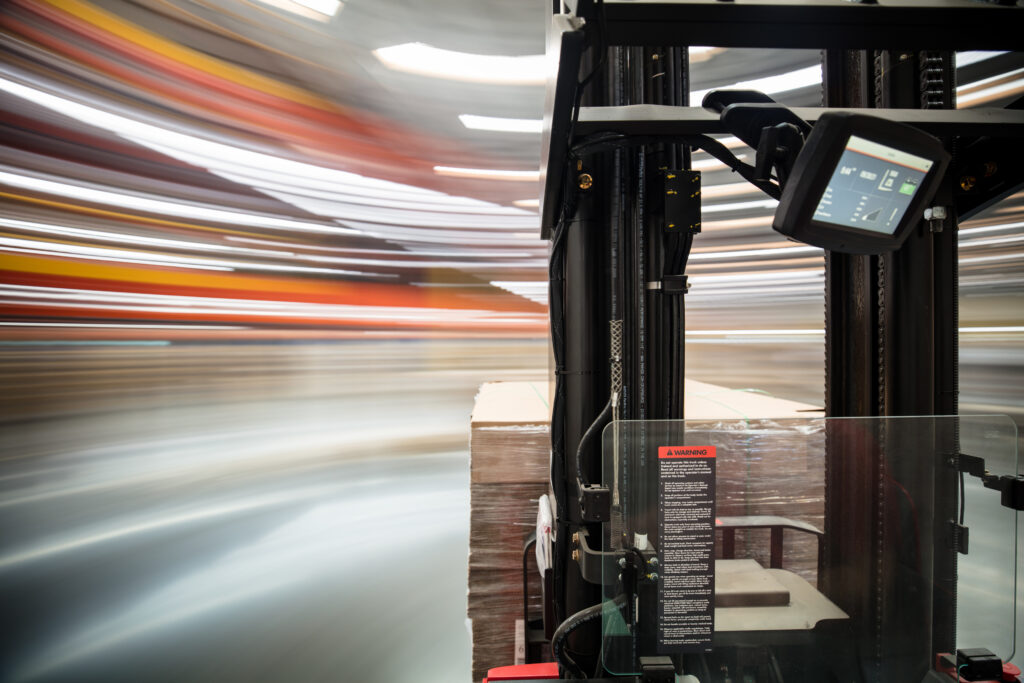 Seit Michae­la Frasch­ke vor eini­gen Mona­ten ihren Füh­rer­schein für den 52-Ton­nen-Gabel­stap­ler gemacht hat, gehö­ren auch Wind­ener­gie­an­lagen­tei­le mit Gewich­ten von bis zu 30Tonnen zu ihrem Umschlag­gut. Häu­fi­ger ver­lädt sie aller­dings Papier­rol­len mit einem Stück­ge­wicht von 2,5 bis 4 Ton­nen vom Lager in den Lkw. Die Rol­len sind so hoch, dass sie gera­de eben auf­recht auf der Lade­flä­che plat­ziert wer­den kön­nen. Und die Ware ist emp­find­lich, hier ist viel Fin­ger­spit­zen­ge­fühl erfor­der­lich.